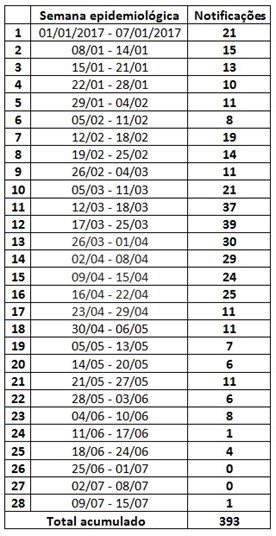 Tabela com o número de casos de zika por semana epidemiológica 2017