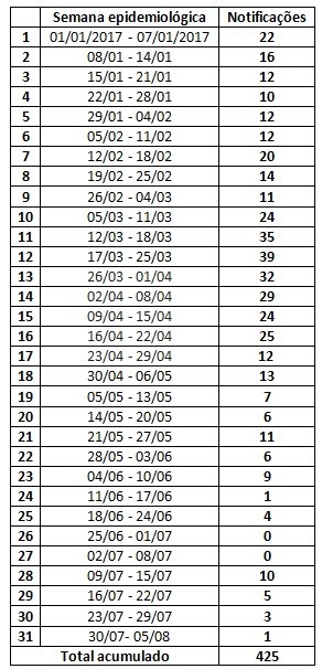 Tabela com o número de casos de zika por semana epidemiológica 2017