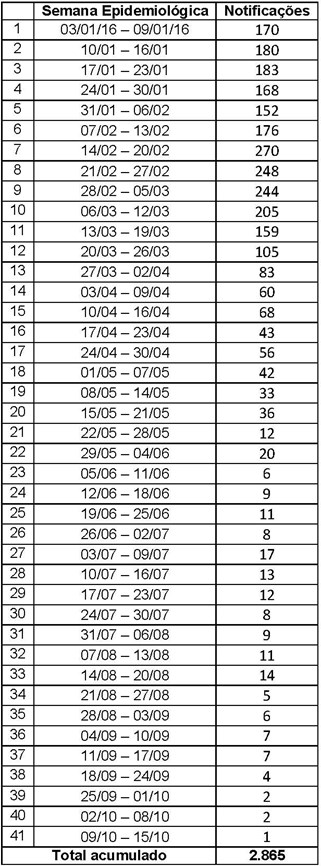 Tabela com o número de casos de zika por semana epidemiológica 2016