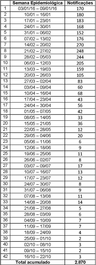 Tabela com o número de casos de zika por semana epidemiológica 2016