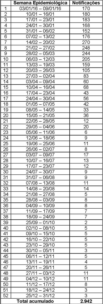 Tabela com o número de casos de zika por semana epidemiológica 2016