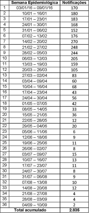 Tabela com o número de casos de zika por semana epidemiológica 2016