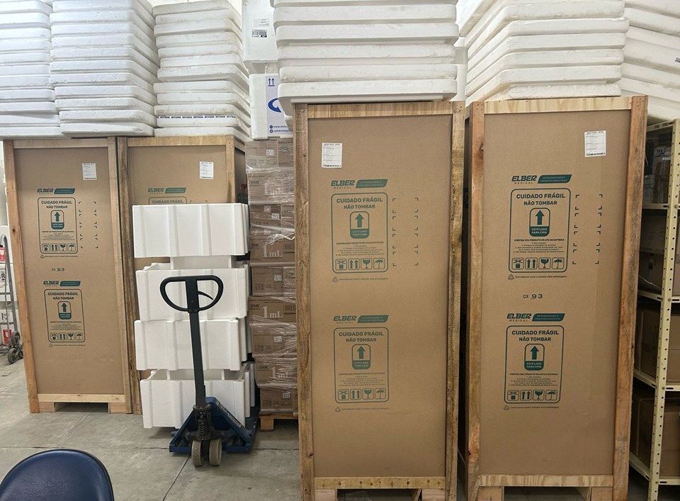 Chegaram ao Espírito Santo 20 novas câmaras de refrigeração para o armazenamento e conservação de vacinas adquiridas pela Secretaria da Saúde (Sesa). Desse total, 18 câmaras serão doadas a municípios capixabas para ampliar e modernizar a Rede de Frio local. Os equipamentos têm capacidade de armazenamento de 500 litros e possuem temperatura regulável mínima de 2°C e máxima de 8°C.