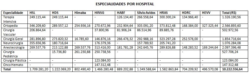 A licitação será feita por unidade hospitalar e por especialidade. No Dório Silva, na Serra, serão seis especialidades; no Antônio Bezerra de Faria, em Vila Velha, serão cinco especialidades; no Silvio Avidos, em Colatina, serão seis especialidades; no Dra. Rita de Cássia, em Barra de São Francisco, serão quatro especialidades; no Hospital Estadual de Vila Velha, serão duas especialidades; no Infantil de Vitória, serão oito especialidades; no São Lucas, em Vitória, serão seis especialidades; no Infantil e Maternidade de Vila Velha, serão quatro especialidades e, no Roberto Arnizaut Silvares, em São Mateus, serão seis especialidades.