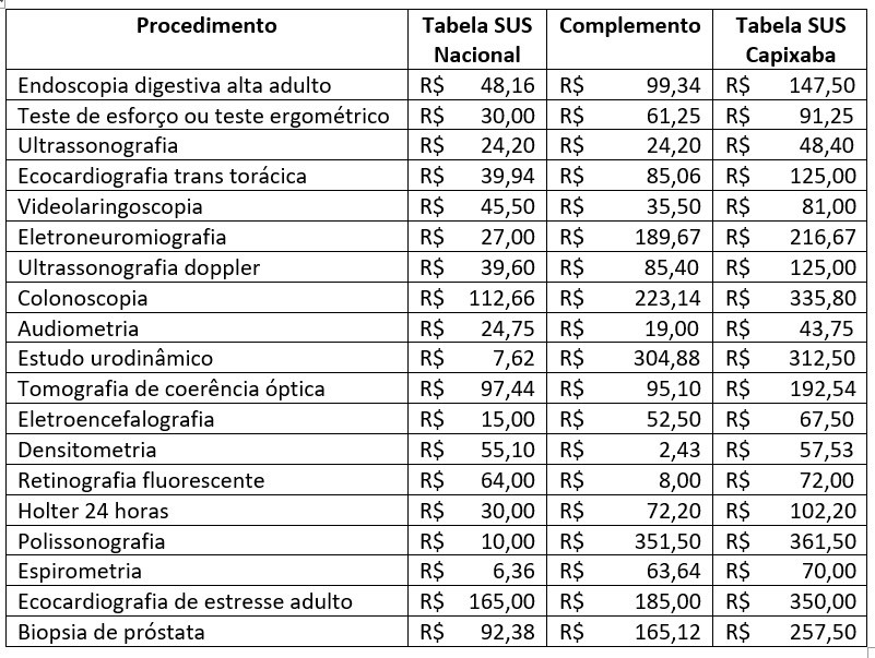 Da mesma forma, como ocorre em âmbito nacional, a Tabela SUS do Espírito Santo prevê a complementação dos valores pagos pela União para consultas e exames aos prestadores de serviços de saúde.