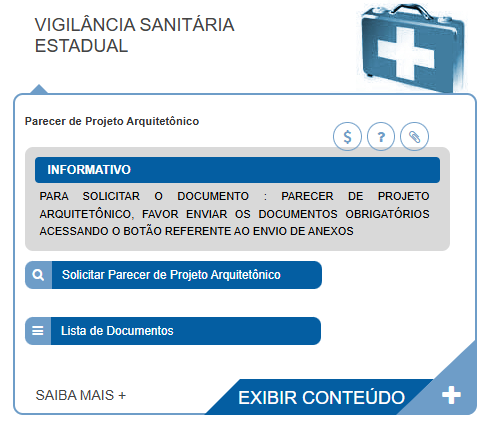 ATENÇÃO! A opção "Solicitar Licença Sanitária" somente ficará disponível após aprovação do projeto arquitetônico pela Vigilância Sanitária.