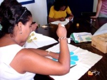 Ana Graziela Medeiros Santos, 22, mora em Vila Velha e participa das atividades do CAPS há dois anos. Já confeccionou tapetes e hoje participa da oficina de bordado e pintura. Faz também bolsas e leva para vender para seus vizinhos. Ela mora ao lado da casa dos pais e dos três irmãos. “Sou a caçula da casa e minha família acha o meu trabalho lindo”, relata empolgada.
